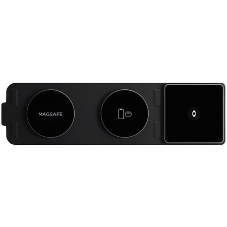 Беспроводное зарядное устройство состоит из трех частей и является универсальным решением для одновременной подзарядки нескольких устройств. Специальные зарядные платформы поддерживают технологию MagSafe и имеют встроенные магниты для гаджетов Apple с поддержкой данной функции. Зарядное устройство имеет ультратонкий и компактный складной корпус – не занимает много места, его удобно брать с собой. Выполнено из качественных материалов – закаленного стекла и эко-кожи. Подключение зарядного устройства к источнику питания происходит с помощью кабеля USB-С (Type-C), благодаря чему обеспечивается быстрая зарядка Power Delivery без потери мощности. Устройство можно, как разложить полностью, так и использовать в сложенном состоянии, чтобы зарядить только один тип мобильных устройств. Гарантирует высокий уровень безопасности в эксплуатации – защищает от перезаряда, перегрева, короткого замыкания и перегрузки тока.