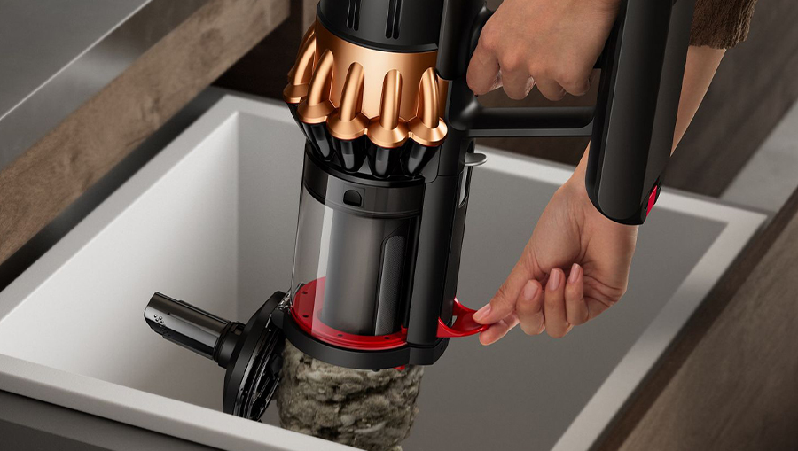 Процесс опорожнения контейнера в Dyson V16 Piston доведен до совершенства: идеально гладкие внутренние поверхности и продуманный механизм сброса обеспечивают автоматическое удаление всего содержимого одним движением. Грязь, волосы и плотно спрессованный мусор выпадают из пылесборника под собственной тяжестью, не налипая на стенки и не требуя дополнительной очистки или контакта с руками. Это делает обслуживание пылесоса максимально гигиеничным и быстрым, полностью исключая риск попадания мелкодисперсной пыли обратно в воздух помещения и обеспечивая ваше абсолютное спокойствие и безупречную чистоту рук.