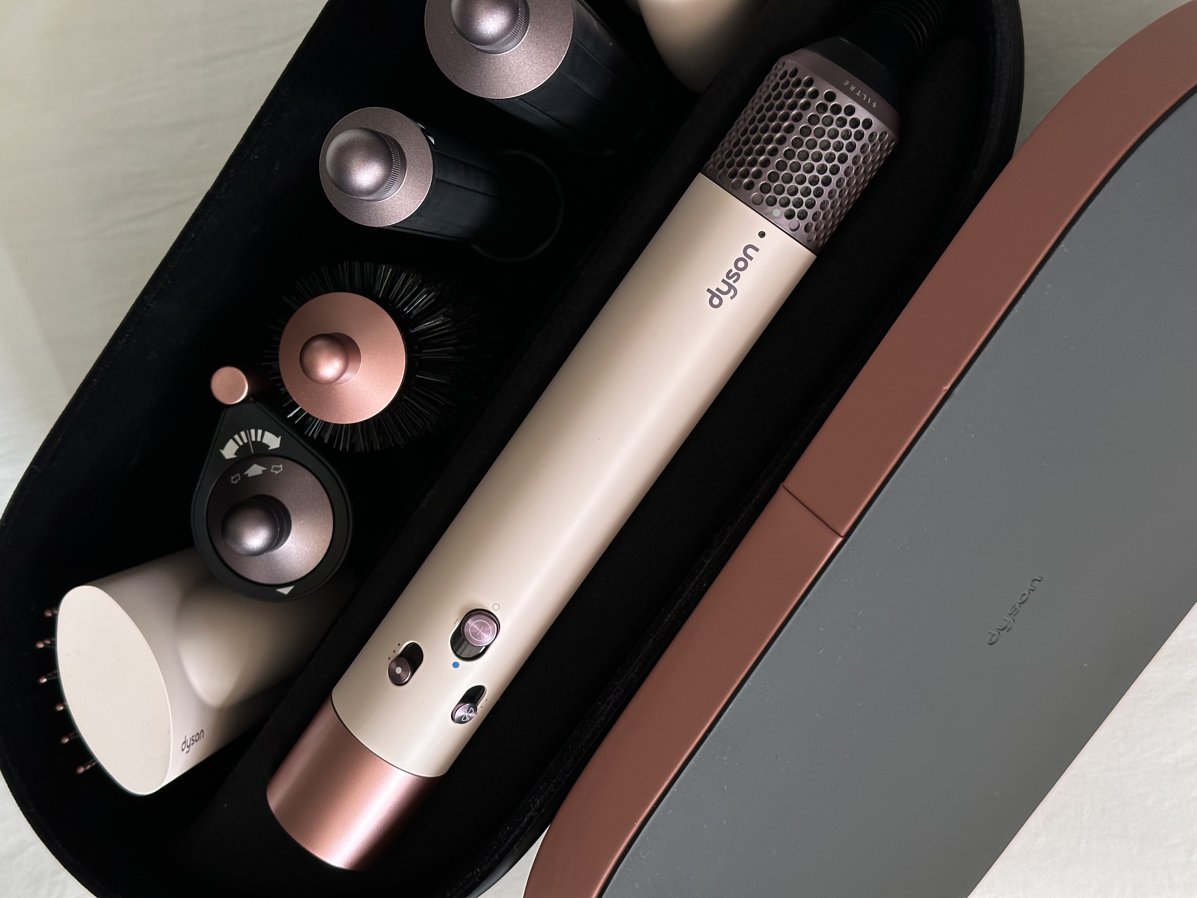 Dyson Airwrap Complete Hairstyler – идеальный стайлер, после использования которого не хочется смотреть на другие варианты. Для того, чтобы любимый гаджет всегда был под рукой и дольше прослужил, в комплект входит стильный кожаный кейс, в котором каждая насадка и основное устройство будет на своём месте.